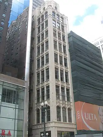 The Singer Building is a skyscraper located at 120 S. State St. in the Loop community area of Chicago, Illinois. The ten-story building was designed by Mundie & Jensen and built from 1925 to 1926. The building's Gothic Revival design features terra cotta decorations, piers at the corners, and sets of three double-hung windows on each story separated by two thin piers. The Singer Corporation initially used the building as office space; the building has had many owners since the Singer Corporation left the building, and was nearly demolished in the 1970s. It is currently owned by FDN Network.[2]
