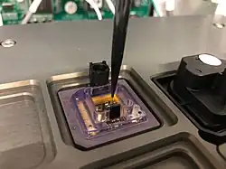 Throughput per experiment for the technology is both influenced by the read length of DNA molecules sequenced as well as total multiplex of a SMRT Cell. The prototype of the SMRT Cell contained about 3000 ZMW holes that allowed parallelized DNA sequencing. At commercialization, the SMRT Cells were each patterned with 150,000 ZMW holes that were read in two sets of 75,000.[22] In April 2013, the company released a new version of the sequencer called the "PacBio RS II" that uses all 150,000 ZMW holes concurrently, doubling the throughput per experiment.[23][24] The highest throughput mode in November 2013 used P5 binding, C3 chemistry, BluePippin size selection, and a PacBio RS II officially yielded 350 million bases per SMRT Cell though a human de novo data set released with the chemistry averaging 500 million bases per SMRT Cell. Throughput varies based on the type of sample being sequenced.[25] With the introduction of P6-C4 chemistry typical throughput per SMRT Cell increased to 500 million bases to 1 billion bases.