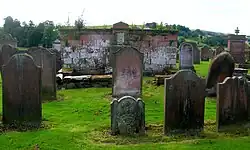 Grierson of Lag was a byword for evil among the common Presbyterian folk in Annandale, who gravely asserted that he, like the other persecutors of the Covenanters, had intimate dealings with the devil, and that he was "partly in hell" before his death, in evidence of which they told that his saliva burnt holes where it fell, and his feet put into cold water made it boil.[7] Lag died, aged 77, at his town house in Dumfries on 31 December 1733. He was buried two days later in the Grierson family burial plot in Old Dunscore Churchyard, the cost of the funeral being £240 Scots. A story was told that on the night he died a chariot surrounded by thunder clouds swept his soul away to hell. Another described how the horses pulling his hearse to Dunscore churchyard died of exhaustion on the way and a black raven flew down and settled on the coffin, flying away only at the moment of burial. The antiquary Charles Kirkpatrick Sharpe claimed that the story regarding the horses was in fact true, and that his grand-uncle Sir Thomas Kirkpatrick, a nephew of Lag's, had both attended the funeral and supplied the horses which subsequently died.[7] Whereas the Presbyterian martyrologists had listed the names of those shot at the hands of Lag's men, the tales that grew up after his death became more lurid, and in later years locals pointed out a spot on Halliday Hill, near Lag Tower, where the Laird was said to have rolled Covenanters downhill in a barrel filled with spikes.[8]