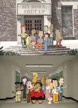 Sit Down, Shut Up (sometimes also known as Sit Down, Shut Up! in some promos) is an American adult animated television series developed by Mitchell Hurwitz for the Fox Broadcasting Company. The series focuses on a group of high school teachers in a small town in Florida "who don't care about teaching".[1] The series premiered on April 19, 2009, in the Fox's Animation Domination block on Fox, but after four episodes aired, Fox removed the show from the block due to low ratings.[2] The remaining nine episodes aired on Saturdays at midnight from later in the year. The show was cancelled on November 21, 2009.[3]
