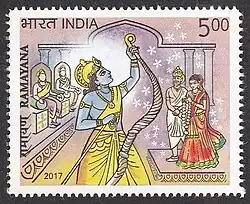 Indian postal stamp showing Lord Rama stringing the divine bow Pinaka at the Sita Swayamvara Shabha in Mithila.