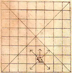 - 1 piece per player. It can move one step in any diagonal direction (as fers in shatranj).