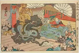 According to legend, in 1277 Nichiren was at Mount Minobu praying when a beautiful woman appeared and interrupted him. Holding up his Buddhist scriptures, Nichiren compelled her to show her true self, at which point she transformed into a shichimen daimyōjin (seven-faced dragon) and vanished.[29] Before Kuniyoshi created this image from accounts of Nichiren's life, it was previously known from at least two older woodblock representations. These include The Life of the Priest Nichiren from the late Tenna period (1681–1684), and an even larger, later version from the Edo period in the Takamizawa collection [4] Later, Kuniyoshi's student, Utagawa Yoshitora, produced a similar work in the form of a triptych known as The Origin of Shichimen Daimyojin (1870).[36]