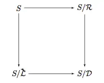 A skew lattice S is symmetric if for any , if and only if . Occurrences of commutation are thus unambiguous for such skew lattices, with subsets of pairwise commuting elements generating commutative subalgebras, i.e., sublattices. (This is not true for skew lattices in general.) Equational bases for this subvariety, first given by Spinks[10] are: and . A lattice section of a skew lattice is a sublattice of meeting each -class of at a single element. is thus an internal copy of the lattice with the composition being an isomorphism. All symmetric skew lattices for which admit a lattice section.[9] Symmetric or not, having a lattice section guarantees that also has internal copies of and given respectively by and , where and are the and congruence classes of in . Thus and are isomorphisms.[7] This leads to a commuting diagram of embedding dualizing the preceding Kimura diagram.