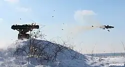 The missile system was used during the pre-2022 Russo-Ukrainian War by Ukrainian forces following first deliveries in 2018.[12] However, it gained wider prominence against Russian Army forces during the 2022 Russian invasion of Ukraine beginning in February alongside anti-tank systems provided by NATO countries such as the FGM-148 Javelin (US) and NLAW (UK/Sweden).[13] On April 5, 2022, Ukrainian forces used the missile system to down a Russian Kamov Ka-52 attack helicopter.[14] Although not as advanced as fire and forget systems such as the Javelin, the Stugna-P possesses a few unique advantages over those weapons. It possesses a longer range overall, flies significantly faster, and is harder to jam due to its SACLOS laser guidance. However, it weighs significantly more than those weapons and cannot be operated by a lone operator.