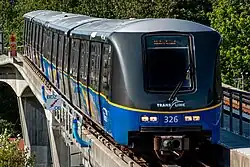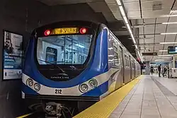 In November 2021, it was revealed that the new cars would carry the designation "Mark V". These would be the first SkyTrain vehicles made by French manufacturer Alstom after their acquisition of Bombardier Transportation in January 2021.[33] It was also at this time that a mockup was sent to TransLink to aid in the design phase.[33][34] As of 2020, the plan was to have one train to arrive per month between June 2024 and September 2027.[36] The order contains an option for the purchase of up to 400 additional cars to support future fleet expansion, replacement, and system extension projects.[37] Assembly for the first cars began in June 2022 at Alstom's Quebec manufacturing plant.[38] Minor construction work was in progress as of February 2023 at select Expo Line stations in order to prepare for the arrival of the first Mark V trains.[39] The first Mark V train was assembled and was undergoing testing at Alstom's facility in Kingston, Ontario, as of August 2023.[40] The first train arrived in December 2023 for testing.[41] In May 2024, Alstom announced that it would be manufacturing an additional 30 Mark V vehicles (six sets) at a cost of $68 million.[42] On March 8, 2025, TransLink had begun field testing of the Mark V trains. Passengers were not permitted to board the trains during testing. With the addition of the six extra trains, the entire fleet of Mark V trains is set to be fully deployed by 2029.[43] As of March 2025, four Mark V trains had been delivered.[44] The first Mark V train entered regular service on July 11, 2025.[45]