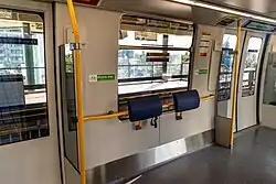 The Hyundai Rotem cars are 3 metres (9.8 ft) in width[49][50] and 20 metres (66 ft) in length,[49][50] both wider and longer than the Bombardier Mark I, Mark II and Mark III cars. Each two-car train has seating for 88 and a normal capacity of 334 passengers at four passengers per square metre (0.37/sq ft), with crush load capacity of 400.[51] A two-car Hyundai Rotem train has more capacity than a four-car Mark I train. The trains feature large, dedicated spaces for wheelchair users, bicycles, and strollers, and sufficient space between seats for luggage. The trains also have large LED displays on both ends of the exterior and interior of the train, displaying the terminus station on exterior signs, with interior displays showing next station, terminus station, and system announcement information.