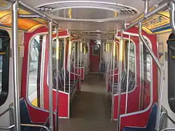 The original fleet consists of 12 metres (39 ft) lightweight Mark I ICTS cars from Urban Transportation Development Corporation, similar to those used by Line 3 Scarborough in Toronto (until its closure in July 2023) and the Detroit People Mover.[9] Mark I vehicles are composed of mated pairs and normally run as six-car trains, but can also be run in two- and four-car configurations. The maximum based on station platform lengths is a six-car configuration, totaling 72 metres (236 ft) The SkyTrain fleet currently includes 150 Mark I trains.[10] These trains have side-facing seats; red, white, and blue interiors; and two doors per car. However, some repainted units feature only blue and white interiors.