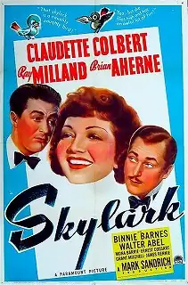 Skylark is a 1941 American comedy film directed by Mark Sandrich and starring Claudette Colbert, Ray Milland and Brian Aherne. It was produced and distributed by Paramount Pictures. Film historian James H. Farmer described Skylark as "light-hearted fluff" with the story of a woman on her fifth wedding anniversary, realizing that she is fed up with always coming in second to her husband's advertising business. Just at that moment, she meets a handsome attorney, and their innocent flirtation begins to turn into something more serious.[1]