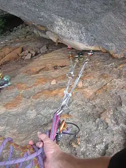 A sling is an item of climbing equipment consisting of a tied or sewn loop of webbing. These can be wrapped around sections of rock, hitched to other pieces of equipment, or tied directly to a tensioned line using a Prusik style knot. They may be used as anchors, to extend an anchor to reduce rope drag, in anchor equalization, or to climb a rope.[1]