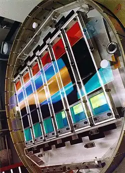 The telescope's imaging camera is made up of 30 CCD chips, each with a resolution of 2048 × 2048 pixels, totaling approximately 120 megapixels.[11] The chips are arranged in 5 rows of 6 chips. Each row has a different optical filter with average wavelengths of 355.1 (u), 468.6 (g), 616.5 (r), 748.1 (i), and 893.1 (z) nm, with 95% completeness in typical seeing to magnitudes of 22.0, 22.2, 22.2, 21.3, and 20.5, for u, g, r, i, z respectively.[12] The filters are placed on the camera in the order r, i, u, z, g. To reduce noise, the camera is cooled to 190 kelvins (about −80 °C) by liquid nitrogen.