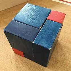 The puzzle is essentially the same if the three 1 × 1 × 1 blocks are left out, so that the task is to pack six 1 × 2 × 2 blocks into a cubic box with volume 27.