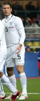 For the 2010 FIFA World Cup qualifiers, Slovenia were drawn into a group with the Czech Republic, Poland, Northern Ireland, Slovakia and San Marino.[39] In its opening match, Slovenia held Poland to a 1–1 draw in Wrocław, before winning two consecutive home games against Slovakia and Northern Ireland.[40] Slovenia then won only one point in two games against the Czech Republic and lost away to Northern Ireland, and thus fell to fifth place in the group.[41] However, the team greatly improved its form and won the last four games without conceding a single goal.[40] As runners-up, Slovenia qualified for the play-offs, where they were drawn against Russia.[42] The first leg was played in Moscow. The match ended in a 2–1 win for the home side,[43] and in the second leg, held in Maribor, Slovenia defeated Russia 1–0 with a goal by Zlatko Dedić. Slovenia advanced to the finals due to the away goals rule.[44] The top scorer of the national team during the qualifying campaign was Milivoje Novaković with five goals.[45]