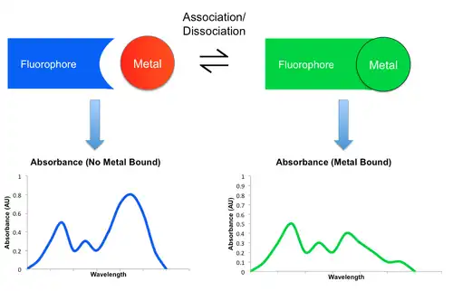 Most detection mechanisms involved in small molecule sensors comprise some modulation in the fluorescent behavior of the sensing molecule upon binding the target metal. When a metal coordinates to such a sensor, it may either enhance or reduce the original fluorescent emission. The former is known as the Chelation Enhancement Fluorescence effect (CHEF), while the latter is called the Chelation Enhancement Quenching effect (CHEQ). By changing the intensity of emission at different wavelengths, the resulting fluorescent spectrum may attenuate, amplify, or shift upon the binding and dissociation of a metal. This shift in spectra can be monitored using a detector such as a microscope or a photodiode.[2][6] Listed below are some examples of mechanisms by which emission is modulated. Their participation in CHEQ or CHEF is dependent on the metal and small molecule sensor in question.
