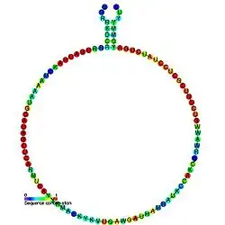 In molecular biology, snoRNA snR60 is a non-coding RNA (ncRNA) molecule which functions in the modification of other small nuclear RNAs (snRNAs). This type of modifying RNA is usually located in the nucleolus of the eukaryotic cell which is a major site of snRNA biogenesis. It is known as a small nucleolar RNA (snoRNA) and also often referred to as a guide RNA. snoRNA snR60 belongs to the C/D box class of snoRNAs which contain the conserved sequence motifs known as the C box (UGAUGA) and the D box (CUGA). Most of the members of the box C/D family function in directing site-specific 2'-O-methylation of substrate RNAs.[1] snoRNA snR60 was initially discovered using a computational screen of the Saccharomyces cerevisiae genome,[2] subsequent experimental screens discovered plant homologues Z15, Z230, Z193 and J17[3] and human U80/SNORD80.