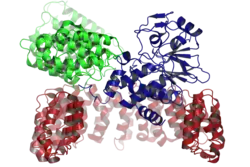 The human protein phosphatase 2A (PP2A) heterotrimeric complex, shown with the regulatory subunit A (red), regulatory subunit B56 (green), and catalytic subunit (dark blue).[12] The overlap between the STag and B56 binding sites on the A subunit is clear.