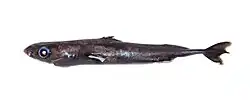 The smalleye pygmy shark (Squaliolus aliae) is a little-known species of squaliform shark in the family Dalatiidae, found in water 150–2,000 m (490–6,560 ft) deep near Japan, the Philippines, and Australia. It migrates vertically daily, spending the day in deep water and the night in shallower water. One of the smallest shark species, the smalleye pygmy shark is known to reach only 22 cm (8.7 in) long. It has a blackish, spindle-shaped body with relatively small eyes, and a spine preceding the first dorsal fin, but not the second. Bioluminescent photophores occur on its underside, which may serve to disguise its silhouette from predators. This species feeds on small squid, krill, shrimp, and bony fishes. It is aplacental viviparous. The International Union for Conservation of Nature has assessed it as Least Concern, citing its wide distribution and lack of threat from fisheries.
