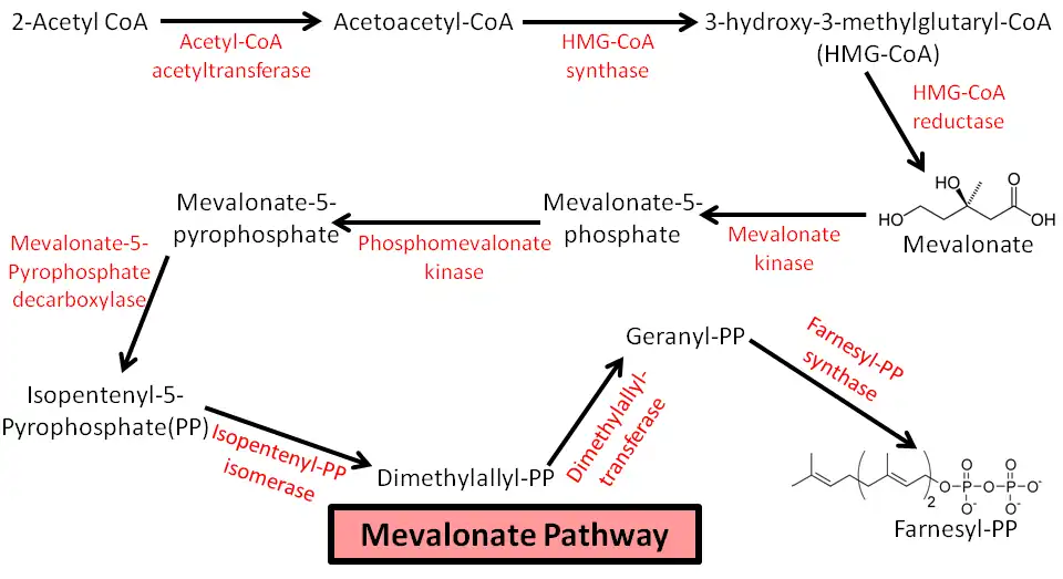 In humans, cholesterol synthesis begins with the mevalonate pathway (see diagram), leading to the synthesis of farnesyl pyrophosphate (FPP). This pathway uses two acetyl-CoA and two NADPH to make mevalonate, which is metabolized to isopentenyl pyrophosphate (IPP) using three ATP. From there, three IPP are needed to make one FPP. The combination of two FPP leads to the formation of squalene; this represents the first committed step towards cholesterol biosynthesis. Squalene leads to the creation of lanosterol, from which there are multiple pathways that lead to cholesterol biosynthesis. The rate limiting step of cholesterol synthesis is the conversion of 3-hydroxy-3-methylglutaryl-CoA (HMG-CoA) to mevalonate, this is an early step in the mevalonate pathway catalyzed by HMG-CoA reductase.[10]
