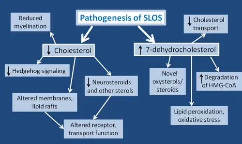 In addition to lowered levels of cholesterol, many of the symptoms shown in SLOS stem from the toxic effects of 7DHC. 7DHC is known to impair intracellular cholesterol transport. It also increases the degradation of HMG-CoA reductase (the enzyme that catalyzes the rate-limiting step in cholesterol synthesis). 7DHC leads to novel oxysterol and steroid derivatives, and many of their functions or effects are yet unknown.[2] A very important finding with respect to 7DHC is that it is the most reactive lipid for lipid peroxidation, and results in systemic oxidative stress. Lipid peroxidation is known to destroy membranes of both cells and membrane-bound organelles. The derivative of 7DHC that is used to indicate oxidative stress is 3β,5α-dihydroxy-cholest-7-en-6-one (DHCEO); it is formed from a primary product of 7DHC peroxidation, 7-DHC-5α,6α-epoxide. DHCEO is toxic to cortical neuronal and glial cells, and accelerates their differentiation and arborization.[17] Through oxidative stress, 7DHC is thought to be responsible for the increased photosensitivity shown in SLOS patients. Normal UVA exposure may lead to oxidative stress in skin cells. Given that 7DHC is more readily oxidized, it enhances the effects of UVA, leading to increased membrane lipid oxidation and increased production of reactive oxygen species (ROS).[16]
