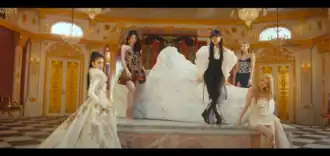 The music video is produced by SL8 Visual Lab and it was directed by 725.[11] The music video opens with Yeji wearing an extravagant gown walking in a hallway with framed pictures of purple sneakers. The next scene shows the quintet decked out in jewels, dancing and singing in a luxurious palace with a grand surrounding of thrones, statues, chandeliers and most notably a structure of a sneaker made using marble. The scene shifts to a military control center where they are assuming command. Later in the clip, the girl group showcase their choreography in an outer space sneaker store. The music video ends with the group striking their signature "crown" pose. Writer Gladys Yeo from NME described the music video as "playful".[12]