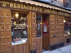 It seems that at the end of the 18th century an establishment known as "Pastelería de Botín" was founded in the Plaza de Herradores in Madrid. Its owner was José Puertas Sánchez, alias Botín, who died in 1847.[4] After the death of José Puertas, his nephew Cándido Remis Puertas took over the shop, although only as a manager or tenant, as the property belonged to his widow, María Prado (who died in 1855), then to her daughter Juana Puertas Prado and, after her death in 1856, to her widower, Eduardo León. In 1865 Cándido Remis broke with Eduardo León and opened his own establishment, "Pastelería de Cándido Remis, sobrino de Botín", at 17 Calle de Cuchilleros. On the façade there is an inscription from the year 1725, which only proves the date when the stone façade was installed, although it is used as a commercial claim about the supposed antiquity of the premises. In the 1930s, Botín was acquired by the married couple Amparo Martín and Emilio González. The González family is still in charge of the restaurant today.