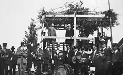 Cyprien Martin, a deputy, became the third president in 1905.[14] The Sixth Acadian National Convention was held in his hometown of Saint-Basile in 1908, attended by 5,000 people, including Louisiana's Chief Justice Joseph Breaux.[14] Emphasis was placed on ties with the Acadian diaspora.[14] Delegates urged newspapers to publish at least one in-depth article weekly, reduce foreign content, and encourage local writers, while again requesting an Acadian bishop.[14]