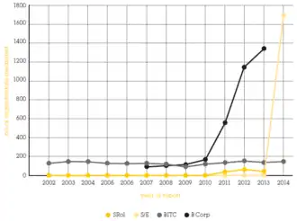 It could be argued that the history of SROI and the fact it was released in 2002, nine years prior to S/E, could indicate why it has a greater number of search engine results. Equally, HACT claims to "have created the largest bank of methodologically consistent and robust social values ever produced."[12] By this they are referring to a database of financial proxy data which can be used in conjunction to SROI, although in August 2015 they have criticised SROI comprehensively in the "Seven Principle Problems of SROI."[13] Continuing with the comparison, in 2014 Lord Loomba presented a report to the House of Lords, "Social Impact Analysis",[14] which included metrics from Business in the Community and Benefit Corporation, as well as SROI and S/E. The steep rise in S/E take-up in 2013 represents the automation of the metric and not necessarily any indication of quality. A 'big-data' approach has been provided by CSR-Hub who have harvested 417 metrics; in May 2014 they announced an MoU with CCEG to explore S/E.[15]