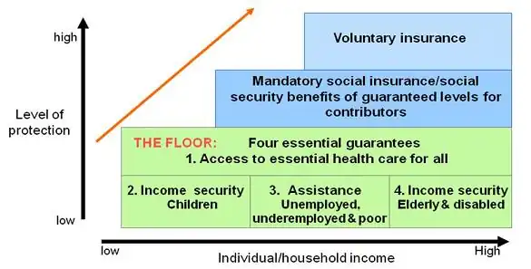The social protection floor (SPF)[27] is the first level of protection in a national social protection system. It is a basic set of social rights derived from human right treaties, including access to essential services (such as health, education, housing, water and sanitation, and others, as defined nationally) and social transfers, in cash or in kind, to guarantee economic security, food security, adequate nutrition and access to essential services.