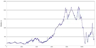 Elevation (in meters) of a race route that crossed the Rocky Mountains, from Illinois to California.