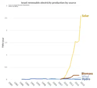 Israel's objective in 2011 was to produce 10% of the country's energy from renewable sources by 2020,[6] and officials from Cabinet and The Electricity Authority gave the goal in 2023 to produce 30% of the country's energy from renewable sources by 2030.[7][8][9]