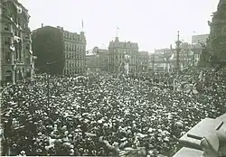 The monument was formally dedicated on May 15, 1902.[31] Thousands came to the public event, which began at 8 a.m. with a parade of flags and veterans of the Mexican-American, Civil, and Spanish–American Wars, and ended with an evening fireworks display. The formal dedication ceremony was held at 10 a.m. with General Lew Wallace as the master of ceremonies. General David R. Lucas led the gathering in prayer, and Governor Winfield T. Durbin, Wallace, and John W. Foster, the former United States Secretary of State under President Benjamin Harrison, gave speeches. A male chorus sang and poet James Whitcomb Riley read his poem "The Soldier", which was written especially for the occasion. Musicians played John Philip Sousa's "The Messiah of the Nations", a march he had composed for the occasion.[32][33] Following a second parade in the afternoon and an evening vesper service, the bells of Christ Church sounded and its choir sang "My Country, 'Tis of Thee".[34]
