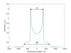 Spinning a powder sample at a slower rate than the largest component of the chemical shift anisotropy results in an incomplete averaging of the interaction, and produces a set of spinning sidebands in addition to the isotropic line, centred at the isotropic chemical shift.[10] Spinning sidebands are sharp lines separated from the isotropic frequency by a multiple of the spinning rate. Although spinning sidebands can be used to measure anisotropic interactions, they are often undesirable and removed by spinning the sample faster or by recording the data points synchronously with the rotor period.