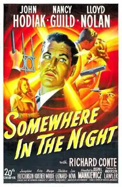 Somewhere in the Night is a 1946 American film noir psychological thriller film directed by Joseph L. Mankiewicz, written by Mankiewicz with Howard Dimsdale and Lee Strasberg based on a short story by Marvin Borowsky. It stars John Hodiak, Nancy Guild, Lloyd Nolan and Richard Conte.