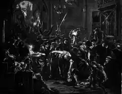To prevent riots, city councilors closed the gates and appealed to Queen Elizabeth of Austria. She ordered calm, threatening an 80,000 grzywna fine for violations.[3] The matter was to be judged by King Casimir IV Jagiellon, absent due to the Thirteen Years' War. However, social unrest grew, and a mob took to the streets. Tęczyński barricaded himself in his house on Bracka Street but deemed it unsafe. With his son Spytek Melsztyński and friends, he sought refuge in the Basilica of St. Francis of Assisi.[3] There, he was killed, his body dragged onto the street, desecrated – his beard and mustache singed, dragged through a gutter to the town hall, and left for three days.[2]