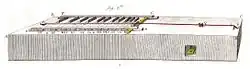 - The top of the box (ABCD) has, in its mid-length, several bridges fixed to the ends of that same number of little movable boards, which fit between [the horizontal sticks] FG and EH. There are twelve of these little boards, which mark the divisions of all the notes of the entire octave, including flats and sharps. A string (OQP) produces the sound of these different notes when it is pinched by the little jack [sauterau] that is activated inside the box by the key R, where it rests upon a little fulcrum. Note that do [ut or C] is exactly in the middle of the two fixed points O and P.