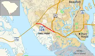 South Carolina Highway 128 (SC 128), is a 2.110-mile (3.396 km) state highway located entirely within Beaufort County, South Carolina. Also known locally as Savannah Highway, SC 128 serves as a principal arterial for the unincorporated Shell Point as well as providing a southern route serving Port Royal,[3] Marine Corps Recruit Depot Parris Island, and the Sea Islands east of Beaufort.