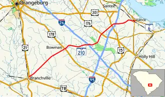 SC 210 begins at an intersection with U.S. Route 21 (US 21; Freedom Road) in Branchville, within Orangeburg County. It travels to the northeast and leaves the city limits. The highway immediately crosses Pen Branch. It continues to the northeast and crosses over Cattle Creek and Sandy Run before entering Bowman. There, it has a very brief concurrency with US 178 (Charleston Highway). The highway crosses over Cow Castle Creek before heading to the east. After an interchange with Interstate 26 (I-26), the highway curves back to the northeast. In Providence, SC 210 intersects US 176 (Old State Road). After crossing over Providence Swamp, the highway intersects US 15 (Bass Drive). It heads to the east again, crossing over I-95. It crosses over Horse Range Swamp and then enters Vance. In town, it crosses a railroad track and intersects SC 310 (Camden Road). In the eastern part of town, it meets its eastern terminus, an intersection with SC 6.[2]