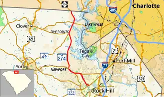 South Carolina Highway 274 (SC 274) is a 17.537-mile (28.223 km) primary state highway in the U.S. state of South Carolina. It connects the cities of Rock Hill and Gastonia, North Carolina. Though it travels generally in a north–south direction, it is signed west–east.