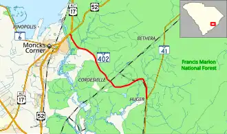 SC 402 is a two-lane rural road that begins at U.S. Route 52 (US 52) and U.S. Route 17 Alternate (US 17 Alt.) near Moncks Corner; per the South Carolina Department of Transportation, SC 402 ends at the pair of U.S. Highways though signage on US 52/US 17 Alt direct travelers "to" SC 402.[1][2] From there, it goes east, through Cordesville and by the Huger Recreational Area. At Huger, it ends at SC 41. Because it traverses mostly in or along Francis Marion National Forest, majority of the route is forested.[2]