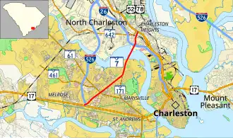 SC 7 begins at an intersection with U.S. Route 17 (US 17; Savannah Highway) in West Ashley. Here, it also has an interchange with Interstate 526 (I-526). It heads east-northeast to an intersection with SC 61. A little while later, it meets the northern terminus of SC 171. Then, the highway crosses over the Ashley River. On the east side of the river, SC 7 enters North Charleston. Almost immediately is an interchange with I-26. About one mile (1.6 km) later, it meets its northern terminus, an intersection with US 52/US 78 (Rivers Avenue).[2]