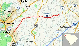 South Carolina Highway 88 (SC 88) is a 14.350-mile (23.094 km) state highway in northern Anderson County, South Carolina with a brief entry into southern Pickens County, connecting Pendleton and areas south of Powdersville.