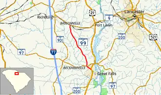 SC 99 begins at an intersection with U.S. Route 21 (US 21) and SC 200 (Pendergrass Boulevard) in Great Falls within Chester County. It travels to the northwest. On the edge of the city limits of the town is an intersection with SC 97 (Francis Avenue). They have a very brief concurrency. SC 99 travels in a north-northwesterly direction and passes Howze Cemetery. The highway continues traveling through rural areas and meets its northern terminus, an intersection with SC 9 (Lancaster Highway).[2]