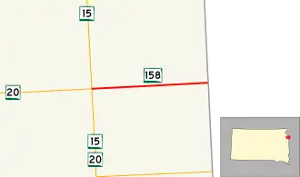 South Dakota Highway 158 (SD 158) is a 9.150-mile-long (14.725 km) state highway in Vernon Township, Grant County, South Dakota, United States. It travels from an intersection with SD 15 and SD 20 to the Minnesota state line, where it continues as County State-Aid Highway 44 (CSAH 44) in Lac qui Parle County.