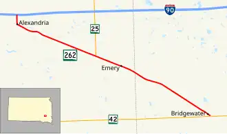 SD 262 begins at a diamond interchange with I-90 in rural Hanson County and heads south. The road almost immediately enters the city of Alexandria and takes the name of Spruce Street. In Alexandria, the route curves to the southeast and parallels a railroad. After this, SD 262 leaves the city and continues southeast. The highway crosses Pierre Creek just east of the city and passes through a series of curves which take the highway farther southeast. The road continues to parallel the railroad and intersects the southern terminus of SD 25 before traversing the community of Emery. East of Emery, SD 262 treks farther southeast through open plains and enters McCook County. The route travels for about six miles (9.7 km), then enters Bridgewater. Here, the highway reaches its eastern terminus at an intersection with SD 42.[2][3]