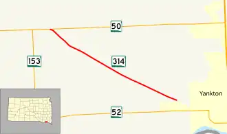 South Dakota Highway 314 (SD 314) is a 3.751-mile-long (6.037 km) state highway in southwestern Yankton County, South Dakota, United States, that runs from SD 50 to the western city limits of Yankton.