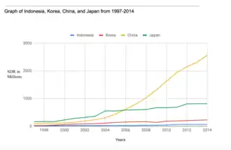 South Korea has not borrowed from the IMF since the 1997 crisis. According to the Organization for Economic Co-operation and Development (OECD), South Korea's reserves have increased from 21.556 billion SDR in 1997 to 247.759 billion SDR in 2014.[13] As of 2022, the nation's foreign reserves were around $420 billion.[14]