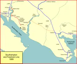 There was a great deal of territory on the coast between Fareham and Southampton, but it seemed to be of limited commercial value, and for some years ideas of a railway through it were discouraging.[5] Passenger and goods transport between Southampton and Portsmouth was swifter and more convenient by coastal shipping.[6]