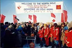 The Russian group consisted of:[7] expedition leader and Arctic explorer Dmitry Shparo; photographer Alexander (Sasha) Belyayev, also in charge of meals; artist Fyodor Konyukhev; cameraman Vladimir Ledenev; physician Mikhail (Misha) Malakhov; radio operators Anatoli Melnikov and Vasili Shishkaryov; Anatoly Fedyakov who was responsible for equipment; and researcher Yuri Hmelevsky. The four Canadians were: navigator Richard Weber; radio operator Laurie Dexter; doctor Max Buxton; and scientist Chris Holloway. (See List of firsts in the Geographic North Pole).