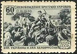The Soviet invasion of Poland was portrayed by the Soviet propaganda as the "liberation of Western Belorussia and Ukraine". Many ethnic Belarusians welcomed unification with the BSSR.[10]
