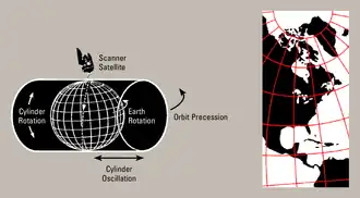 Space-oblique Mercator projection is a map projection devised in the 1970s for preparing maps from Earth-survey satellite data. It is a generalization of the oblique Mercator projection that incorporates the time evolution of a given satellite ground track to optimize its representation on the map. The oblique Mercator projection, on the other hand, optimizes for a given geodesic.